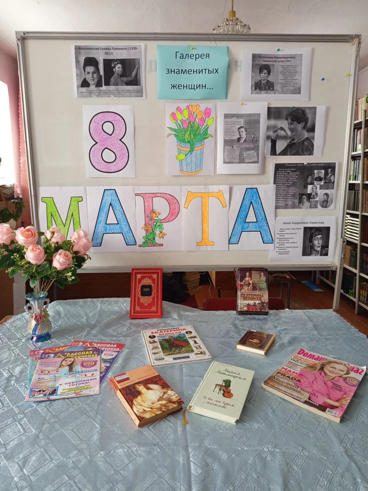 Читатели смогут познакомиться с историей праздника, который возник в конце 19 века, как день борьбы за права женщин. Библиотекари проводят обзор книжных выставок, представив произведения о женщинах, оставивших след в русской истории в разных областях деятельности. Книги познакомят читательниц с произведениями женской прозы, где главная героиня женщина и сюжет связан с женской судьбой.